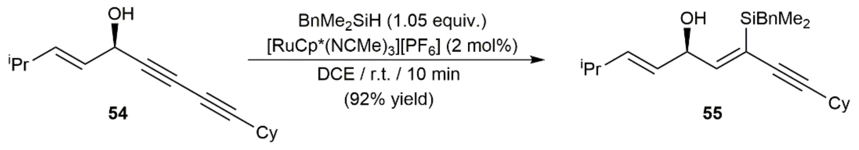 - Walkowiak, J.; Salamon, K.; Franczyk, A.; Stefanowska, K.; Szyling, J.; Kownacki, I. Pt-catalyzed hydrosilylation of 1,3-diynes with triorganosilanes: Regio- and stereoselective synthesis of mono- or bis-silylated adducts. J. Org. Chem. 2019, 84, 2358–2365. [Google Scholar] [CrossRef] [PubMed]