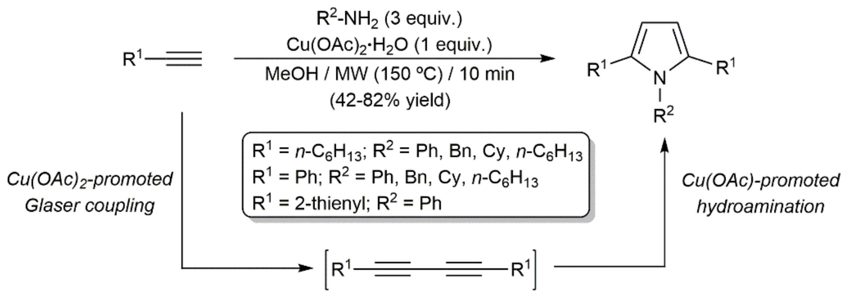 - Schulte, K.E.; Reisch, J.; Walker, H. Eine neue pyrrolsynthese aus butadiin-derivaten. Chem. Ber. 1965, 98, 98–103. [Google Scholar] [CrossRef]