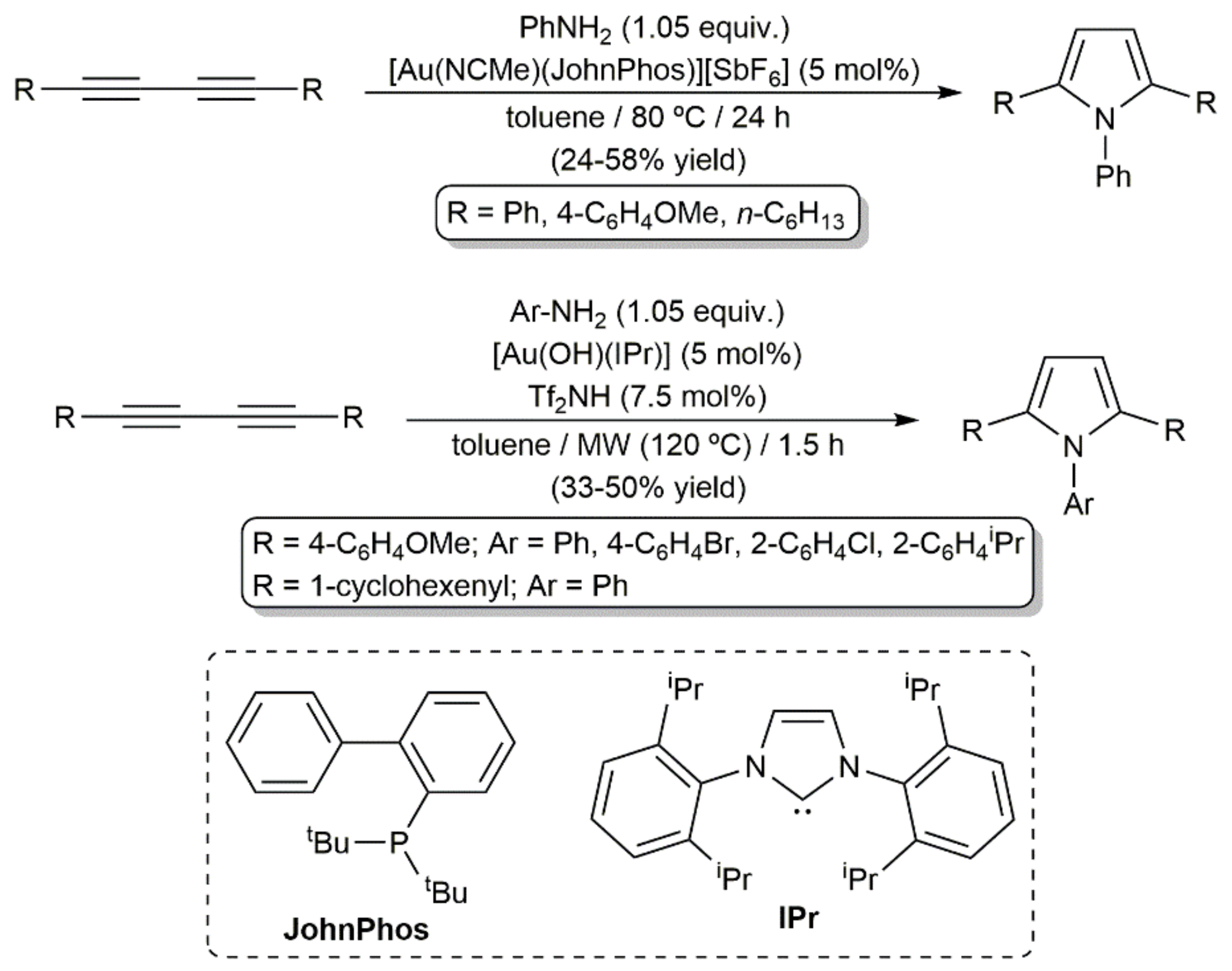 - Stylianakis, I.; Faza, O.N.; López, C.S.; Kolocouris, A. The key role of protodeauration in the gold-catalyzed reaction of 1,3-diynes with pyrrole and indole to form complex heterocycles. Org. Chem. Front. 2020, 7, 997–1005. [Google Scholar] [CrossRef]