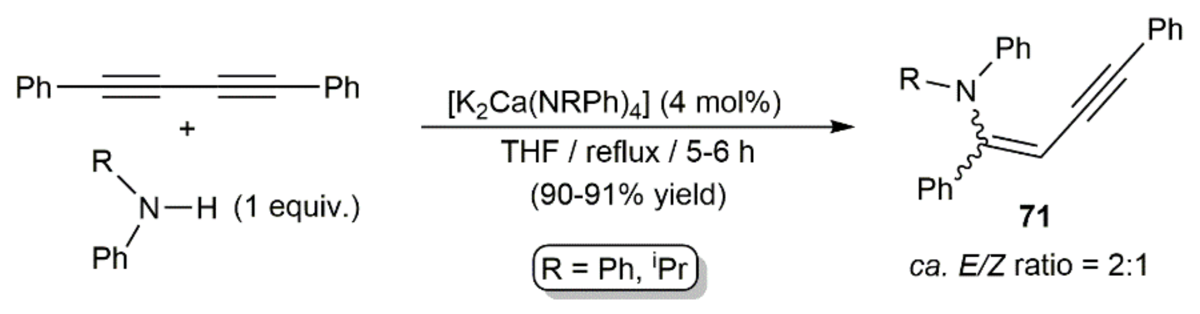 - Younis, F.M.; Krieck, S.; Görls, H.; Westerhausen, M. Hydroamination of diphenylbutadiyne with secondary N-methyl-anilines using the dipotassium tetrakis(2,6-diisopropylanilino)calciate precatalyst. Dalton Trans. 2016, 45, 6241–6250. [Google Scholar] [CrossRef]