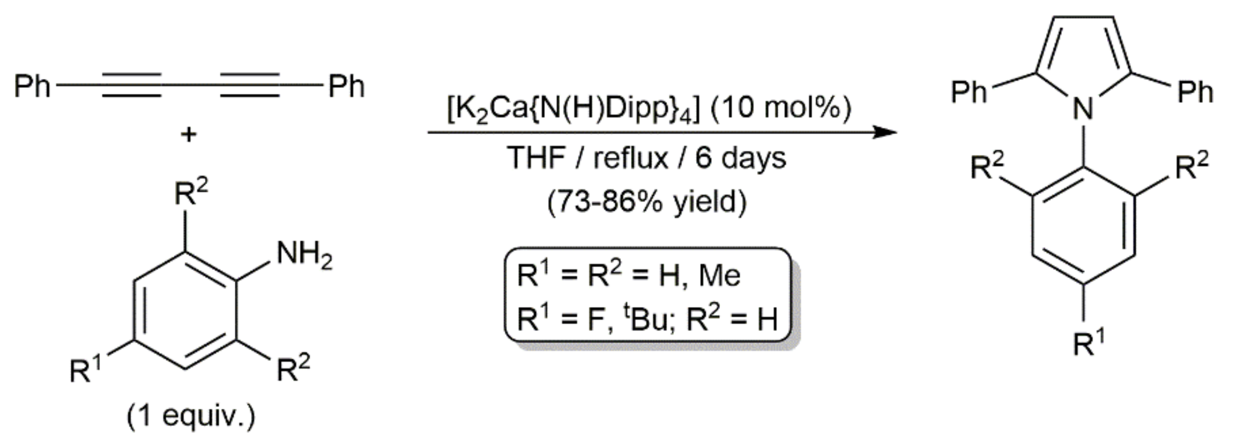 - Younis, F.M.; Krieck, S.; Görls, H.; Westerhausen, M. s-Block-metal-mediated hydroamination of diphenylbutadiyne with primary arylamines using dipotassium tetrakis(amino)calciate precatalyst. Organometallics 2015, 34, 3577–3585. [Google Scholar] [CrossRef]
