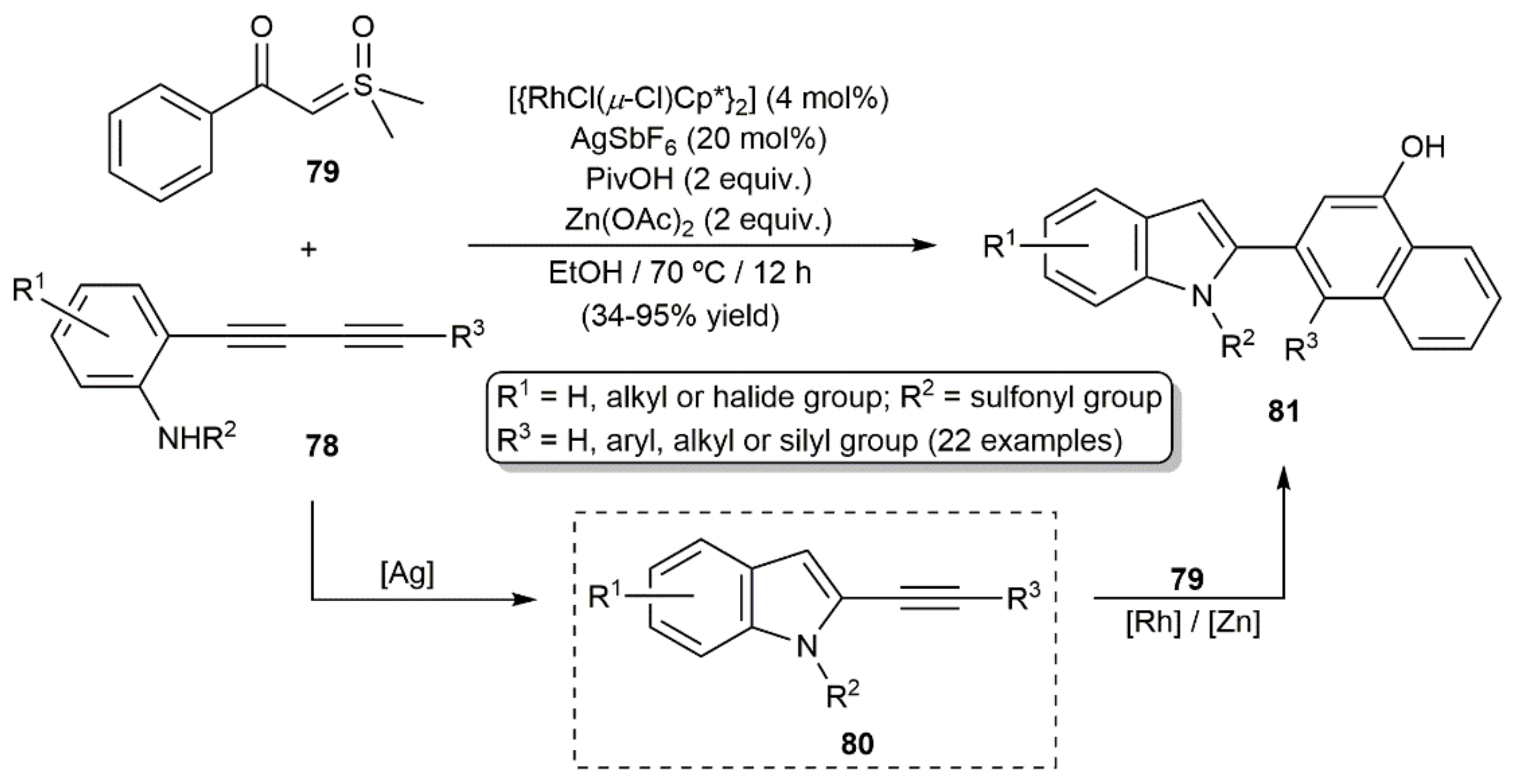 - Liu, R.; Wei, Y.; Shi, M. Rhodium(III)-catalyzed cross coupling of sulfoxonium ylides and 1,3-diynes to produce naphthol-indole derivatives: An arene ortho C-H activation/annulation cascade. ChemCatChem 2020, 12, 5903–5906. [Google Scholar] [CrossRef]