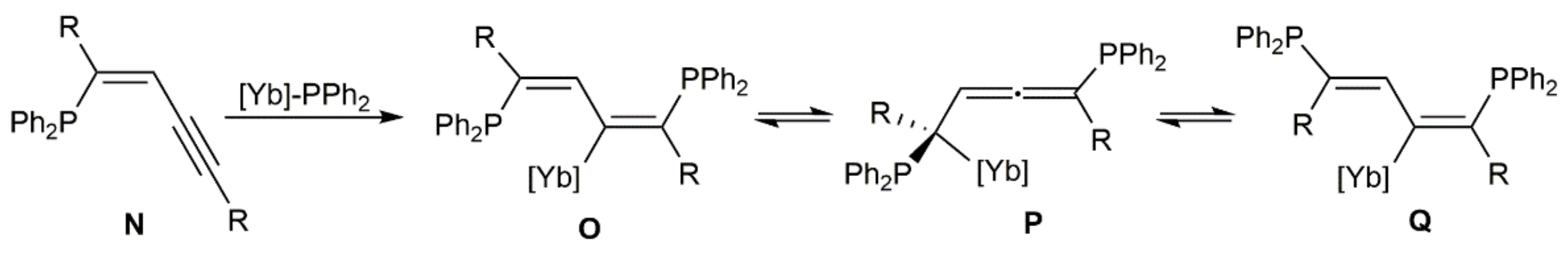 - Takaki, K.; Takeda, M.; Koshoji, G.; Shishido, T.; Takehira, K. Intermolecular hydrophosphination of alkynes and related carbon-carbon multiple bonds catalyzed by ytterbium-imine complexes. Tetrahedron Lett. 2001, 42, 6357–6360. [Google Scholar] [CrossRef] [Green Version]