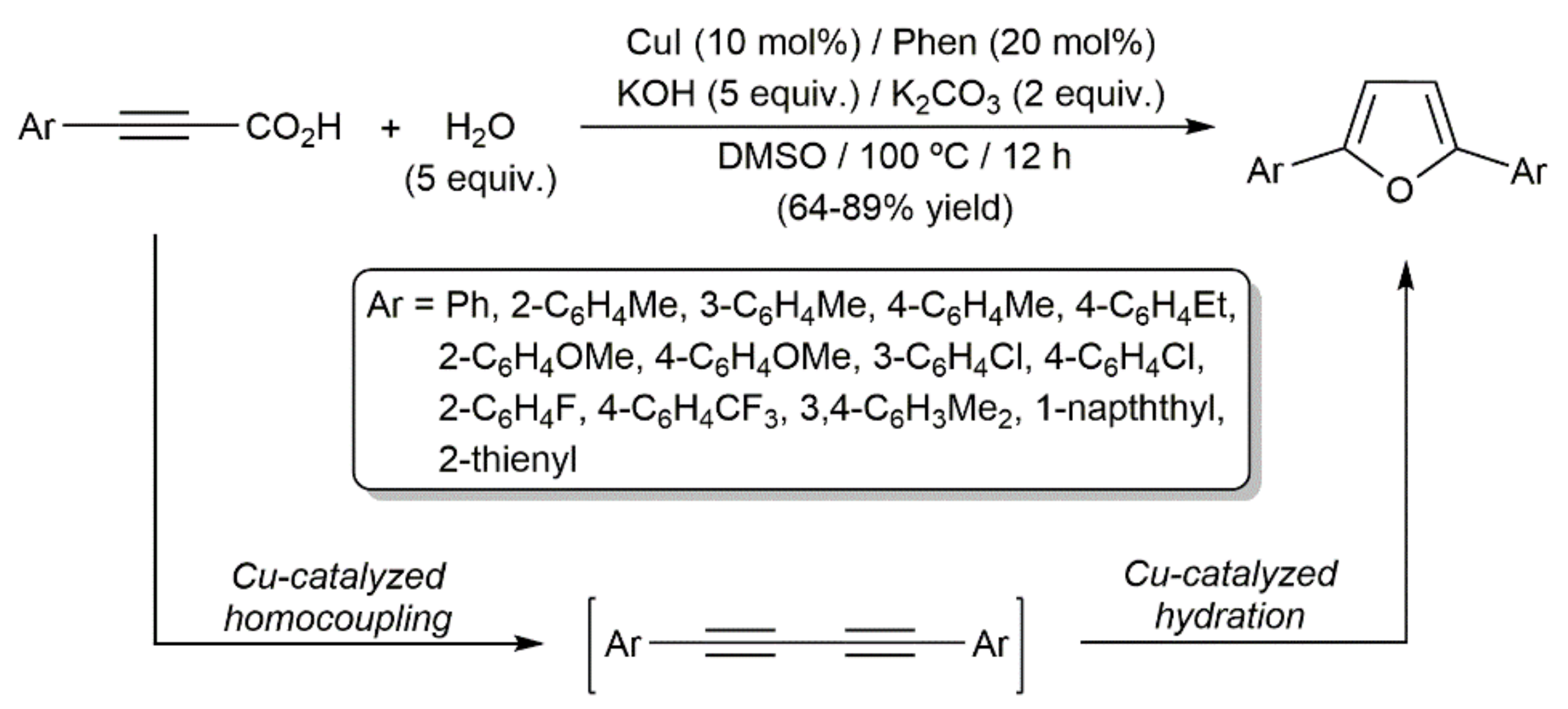 - Irudayanathan, F.M.; Raja, G.C.E.; Lee, S. Copper-catalyzed direct synthesis of furans and thiophenes via decarboxylative coupling of alkynyl carboxylic acids with H2O or Na2S. Tetrahedron 2015, 71, 4418–4425. [Google Scholar] [CrossRef]