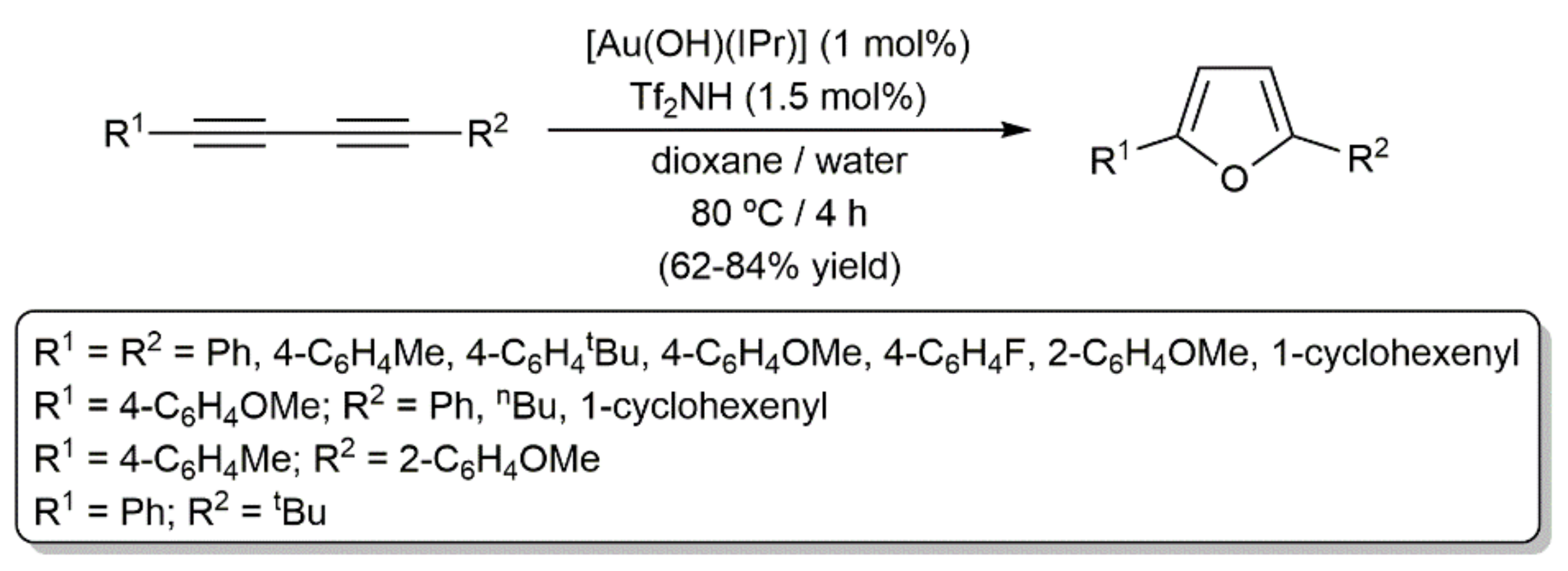 - Zheng, Q.; Hua, R.; Yin, T. Palladium-catalyzed cycloaddition of 1,3-butadiynes with water: An alternative efficient catalytic system for atom-economic synthesis of 2,5-disubstituted furans. Curr. Org. Synth. 2013, 10, 161–164. [Google Scholar]
