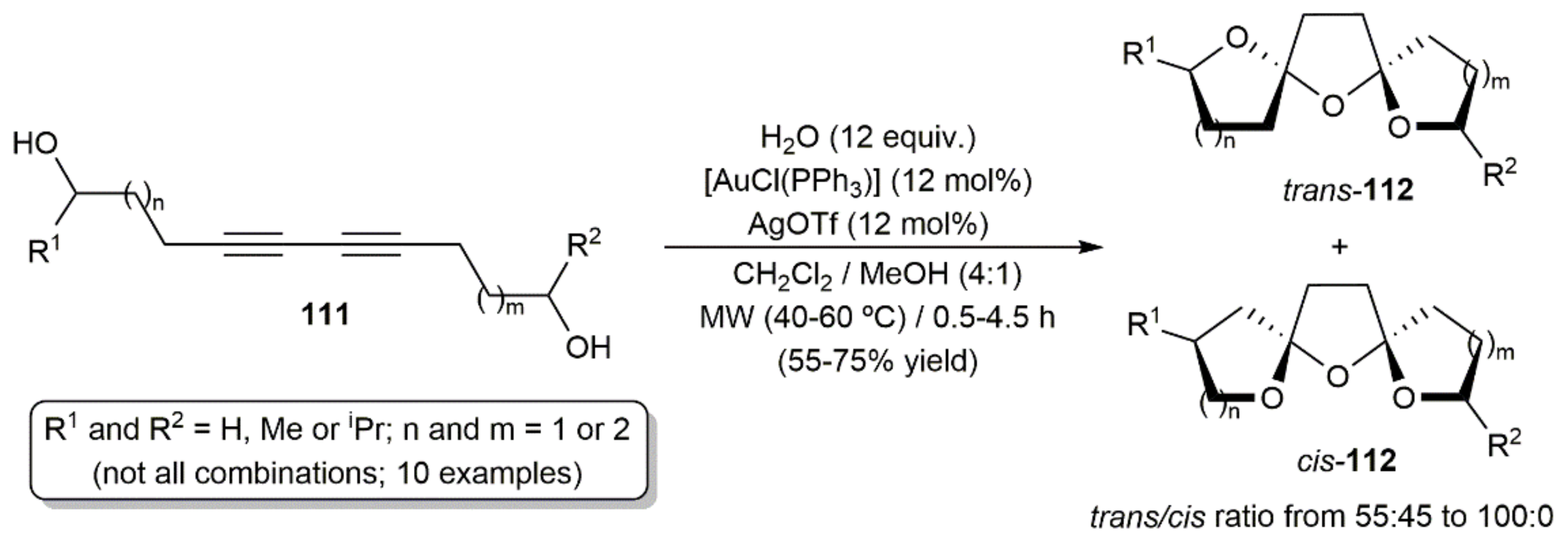 - Volchkov, I.; Sharma, K.; Cho, E.J.; Lee, D. Efficient one-step synthesis of bis-spiroketals from diynediols by π-Lewis acid-catalyzed hydroalkoxylation/hydration. Chem. Asian J. 2011, 6, 1961–1966. [Google Scholar] [CrossRef] [PubMed]