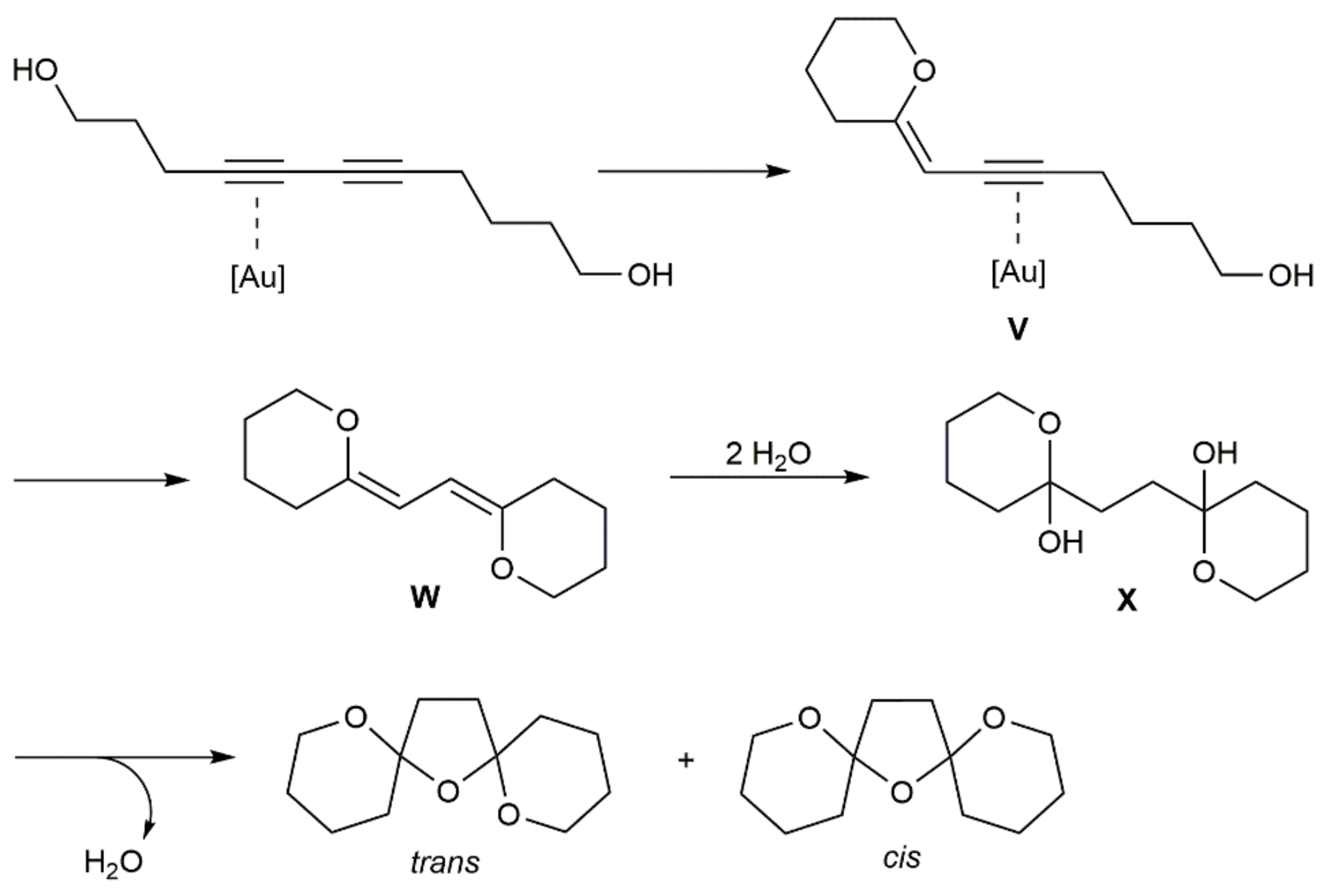 - Sharma, K. Unraveling the mechanism of tricyclic bis-spiroketal formation from diyne diol by DFT study. Lett. Org. Chem. 2019, 16, 392–395. [Google Scholar] [CrossRef]