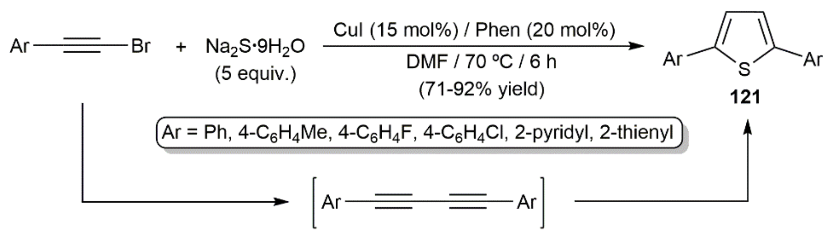 - Rao, M.L.N.; Islam, S.K.; Dasgupta, P. Rapid access to unsymmetrical 1,3-diynes and 2,5-disubstituted thiophenes under ligand and Pd/Ni-free Cu-catalysis. RSC Adv. 2015, 5, 78090–78098. [Google Scholar] [CrossRef]