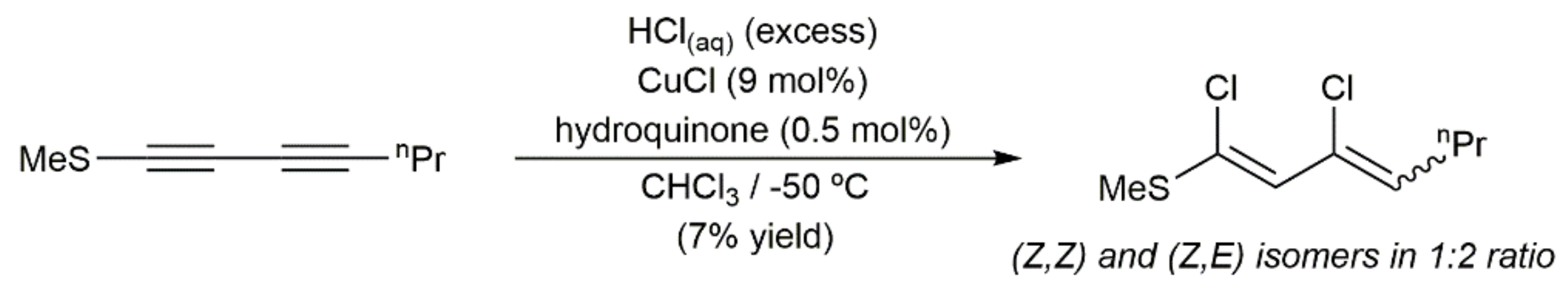 - Profir´eva, Y.I.; Vasil´eva, L.A.; Turbanova, E.S.; Petrov, A.A. Electrophilic and radical addition of hydrogen halides to diacetylene and its homologs. Russ. J. Org. Chem. 1969, 5, 591–600. [Google Scholar]