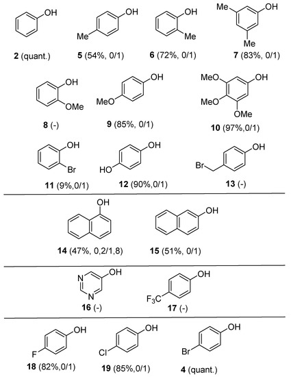 - Elumalai, V.; Hansen, J.H. A scalable and green one-minute synthesis of substituted phenols. RSC Adv. 2020, 10, 40582. [Google Scholar] [CrossRef]