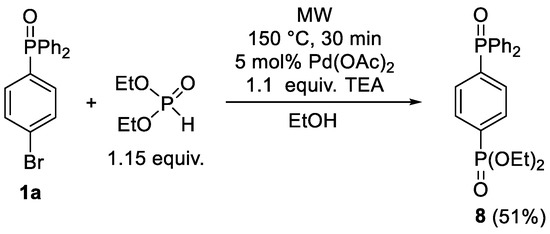 In order to prepare a mixed derivative, 4-bromophenyl-diphenylphosphine oxide 1a was reacted with 1.15 equivalents of (EtO)2P(O)H in the presence of 5 mol% of Pd(OAc)2 and 1.1 equivalents of NEt3 in EtOH at 150 °C under MW irradiation. The useful conversion of ca. 80% allowed a 51% isolated yield of 4-diethylphosphonoylphenyl-diphenylphosphine oxide 8 after chromatography (Scheme 1).