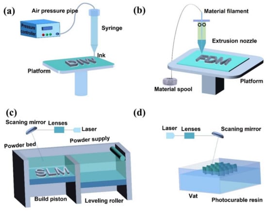 Schematic diagrams for (a) DIW, (b) FDM, (c) SLM and (d) SLA 3D printing strategies.