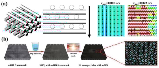(a) Schematic of FCC structure (left) and simulation of velocities (right); []. Reproduced with permission from ref. (Stuecker al., 2004) Copyright, 2004, ACS. (b) The synthesis process of 3D-printed r-GO framework anchored with Ni nanoparticles []. Reproduced with permission from ref. (Qiao et al., 2018) Copyright, 2018, John Wiley and Sons.