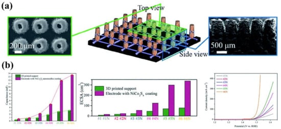 Ding’s group constructed 3D stainless steel supports with hollow porous cone arrays by SLM, providing a large surface area for the following in-situ growth of active NiCo2S4 nanoneedles (Figure 4) []. The designed 3D printed architecture endows high loading of active electrolytes, the electrochemically active surface area of the 3D electrode was nine times that of the plate structure. Combining with deposited NiCo2S4 catalyst, this electrode delivered excellent OER performance. By loading Ni/CeO2-ZrO2 on 3D stainless-steel honeycomb supports, better heat transfer was realized and the activation time for methane dry reforming was saved.
