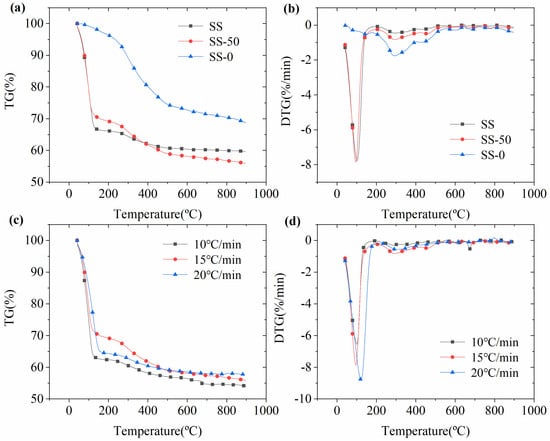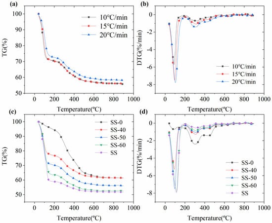 TG (a,c) and DTG (b,d) curves of SS pyrolysis at different heating rates (SS-50) and moisture contents.