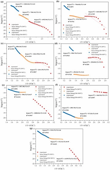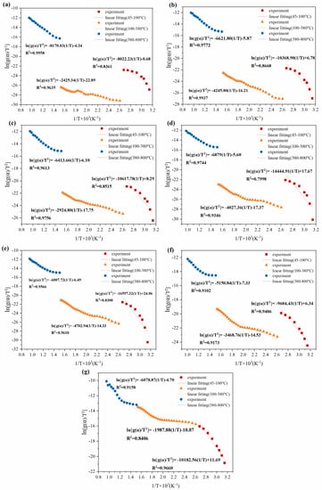 Linear fitting in combustion kinetics of semi-dry SS with different mixing ratio. (a) BC, (b) SS-50-BC95, (c) SS-50-BC90, (d) SS-50-BC85, (e) SS-50-BC80, (f) SS-50-BC70, (g) SS-50-BC40.