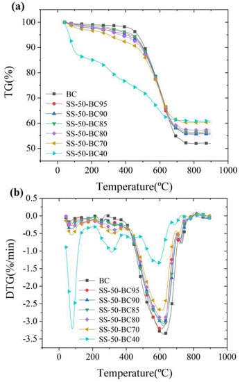 Figure 4 shows the TG and DTG analysis results of the co-combustion of semi-dry SS and BC at different mixing ratios of semi-dry SS. In addition, the TG and DTG analysis results show that the BC and semi-dry SS have completely different combustion characteristics. The co-combustion of semi-dry SS and BC can be divided into three stages. The first stage is about the release of free water and bound water, because many hydrophilic groups are present in the organic matter of the SS, leading to a large weight-loss peak in this stage, and the temperature range of this stage is from 25 °C to about 200 °C. Owing to the low moisture content of BC, the weight loss is not obvious at this stage of the combustion of BC.