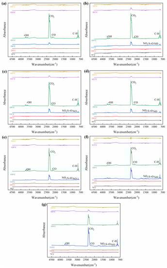 FTIR spectra for volatiles with different temperatures during the combustion process. (a) BC, (b) SS-50-BC95, (c) SS-50-BC90, (d) SS-50-BC85, (e) SS-50-BC80, (f) SS-50-BC70, (g) SS-50-BC40.