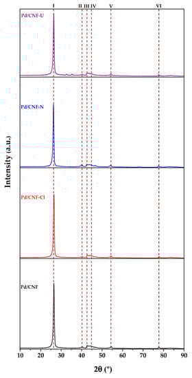 The X-ray diffraction (XRD) patterns of the fresh reduced catalysts are shown in Figure 2. The peaks present at around 26°, 42.5°, 45°, 54°, and 78° are related to the typical crystalline carbon facets usually appearing on structured carbon materials: C(002), C(100), C(101), C(004), and C(110), respectively []. The peak at around 40° corresponds to Pd (111) []. As can be seen, the intensity of the Pd peak increases in the following order: Pd/CNF-U < Pd/CNF-Cl < Pd/CNF-N < Pd/CNF, as did the mean NP sizes (Table 1). Pd/CNF-U shows two other peaks at around 33° and 36° related to the urea []. Probably, the interaction between urea and CNF is forming N-doped CNF.