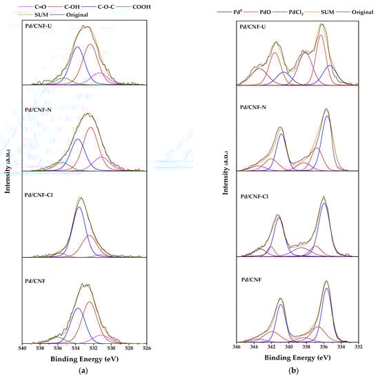 The X-ray photoelectron spectroscopy (XPS) spectra and the deconvoluted species of all fresh reduced catalysts are shown in Figure 3 and Figure 4. The elemental atomic compositions of all species and the relative atomic compositions of O 1s, Pd 3d, and N 1s are summarized in Table 2, Table 3, Table 4 and Table 5. In all cases, the O 1s spectrum can be deconvoluted into four species: C=O: 531.1 eV; C-OH: 532.3 eV; C-O-C: 533.5 eV; and COOH: 534.7 eV (Figure 3a). Each Pd 3d spectrum can be deconvoluted into a doublet (Pd 3d5/2 and Pd 3d3/2) separated by 5.26 eV. The peaks at around 335.6 eV (and 340.9 eV) are related to the zero-valent Pd (Pd0), the peaks at around 336.7 eV (and 342.0 eV) correspond to PdO, and the peaks at around 338.3 eV (and 343.6 eV) correspond to PdCl2 (Figure 3b). The sum of their values is listed in Table 4 presented as electro-deficient species (Pdn+). On Pd/CNF-U, the N 1s spectrum can be deconvoluted into two species: pyridinic N: 398.5 eV; pyrrolic N: 400 eV; [].