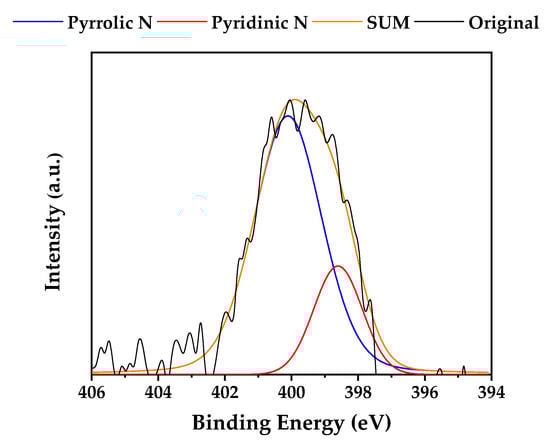 The formation of Pd0 seems to be promoted by the presence of electron-donating groups. As can be seen in Table 2, the proportion of oxygen (O 1s %) is higher in the functionalized catalysts than in the untreated catalyst. Regarding the oxygen functionalities, although different compositions of each species are observed (Table 3), C-OH and C-O-C, are the main oxygen functional groups in all catalysts, which are electron-donating groups, that was found to favor the selectivity to olefins []. The catalysts show slight differences in the proportion of electron-donating groups (C-OH + C-O-C), increasing in the order: Pd/CNF-U (72%) < Pd/CNF-N (78.1%) < Pd/CNF (82.0%) < Pd/CNF-Cl (91.5%) in agreement with the increasing order of Pd0 species (Table 4). Among the four catalysts, Pd/CNF-U shows a much lower Pd0 proportion (20.7%) than Pdn+ (79.3%) (Table 4), owing to the stronger metal–support interactions given by the presence of nitrogen functional groups, pyridinic N and pyrrolic N on the N-doped CNF (Figure 4 and Table 5). According to a previous DFT study [], these nitrogen functional groups may strongly interact with Pd atoms.
