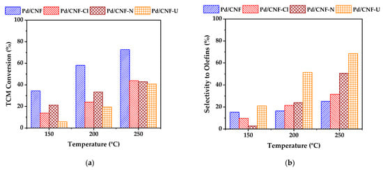 The surface functional groups may also influence the olefins’ production during the TCM HDC []. The presence of surface functional groups usually yields small metal particles through strong metal–support interactions []. Small NPs sizes were found to promote the selectivity to olefins []. Moreover, the different nature of surface groups may modify the electron density of Pd, which also influences the activity of the catalysts. The modification of the surface chemical properties of CNF has been widely studied by employing different agents such as HCl [], HNO3 [,], urea [,,], H2SO4 [,], NH3 [,,], and KOH []. CNF treated with HCl and HNO3 were employed as catalyst supports in the HDC of 1,2-dichlorobenzene [] using Pd-based catalysts. The Pd/CNF-HCl provided highly dispersed small Pd NPs, favoring the catalyst activity. CNF-HNO3 generated a higher concentration of surface oxygen groups than CNF-HCl, but lower metal–support interactions [,]. Urea is considered a facile and economical nitrogen resource to synthesize N-doped CNF, which, used as catalyst support, could provide strong metal–support interactions and lead to highly stable activity []. Thus, the functionalized CNF seems to be an attractive catalyst supports to produce olefins by HDC.