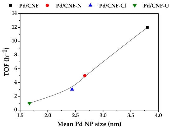 The activity and selectivity results obtained during the HDC of TCM using the four catalysts (Pd/CNF, Pd/CNF-Cl, Pd/CNF-N, and Pd/CNF-U) are shown in Figure 5. The products obtained are: C1 (CH4); C1+ paraffins: ethane (C2H6), propane (C3H8), and traces of n-butane (n-C4H10); Olefins: C2H4, C3H6, and traces of 1-butene (1-C4H8); Chloromethanes: monochloromethane (MCM) and DCM. Figure 5a shows the influence of support functionalization on the activity of the catalysts at different reaction temperatures. The functionalized catalysts show considerably lower TCM conversion owing to the formation of the smaller Pd NPs by the interaction with the surface functional groups. As expected, TCM conversion of all catalysts increases when reaction temperature increases. Turnover frequency (TOF) values were calculated at 150 °C. The relationship between the TOF values of catalysts and their mean Pd NP sizes is shown in Figure 6. TOF values decrease in the following order Pd/CNF (12 h−1) > Pd/CNF-N (5 h−1) > Pd/CNF-Cl (3 h−1) > Pd/CNF-U (1 h−1), as Pd NP sizes decrease, similar results were observed in some previous studies using Pd-based catalysts in the HDC of chloromethanes [,].