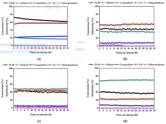 Stability of catalysts during the HDC of TCM: (a) Pd/CNF, (b) Pd/CNF-Cl, (c) Pd/CNF-N, (d) Pd/CNF-U (Treaction = 250 °C; τ = 0.2 kg h mol−1; H2/TCM = 50).