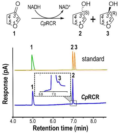 The enantioselectivity was determined with gas chromatography (GC), using standard DHF-3-one (1), (S)-isomeric (2), and racemic (2 & 3) DHF-3-ol. As shown in Figure 1, the retention time of (S)-isomer is slightly shorter than that of (R)-isomer by about 6 s in the GC enantiomer separation. As shown in Figure 1, the CpRCR-catalyzed reduction of DHF-3-one exhibits a very high enantioselectivity, with a dramatic preference for (S)-isomer at 96.4% enantiomeric excess (% ee). This result is parallel to a modified biocatalyst Thermoethanolicus brokii (TbSADH) in previous studies []. However, this is the first time that wild type CpRCR was observed to efficiently catalyze the enantioselective reduction without any further protein engineering.