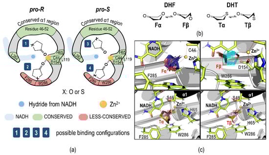 One of the possible rationales is that the small cavity provides stronger hydrophobic interactions with the side-chains of F285 and W286, because the methylene groups of the heterocyclic substrates were consistently found to be <3 Å toward F285 and W286. Intriguingly, conformer Fα (α conformer of DHF) presents a considerable number of pro-R poses toward the R-isomer, while only one of the low-energy poses with conformer Fβ adopted the reactive pro-R configuration (others are unproductive in reduction due to the lack of the proper O-Zn coordination). In the case of DHT, the docking poses of conformers Tα and Tβ strongly preferred pro-S configuration. The molecular docking suggests that the O/S swap in the 5-m-r heterocyclic ketone substrates significantly influences the binding orientation.