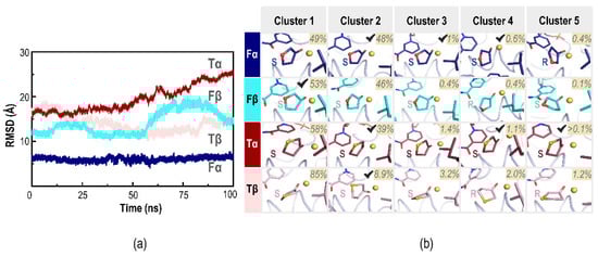 Dynamic structures of substrates in CpRCR. (a) the time-resolved RMSD plot of the 5-m-r heterocylic ketones with the reference of protein backbones, upon the four trajectories starting from the lowest-energy docking poses, (b) the clustering analysis of the MD simulations. NADH is shown behind the substrate. The catalytic zinc is shown in yellow orange. The oxygen and the sulfur atoms are indicated with a sphere (colored red and yellow) to determine the substrate orientation (R, up; S, down). The clusters with the attacking distance of coenzyme NADH were marked with black ticks.