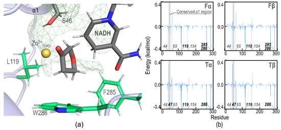 It is reported that disubstituted ketones, such as acetophenone and α-ketoglutarate ketone variants, follow Prelog’s orientation, in which the large substituent group sits in the large cavity and the small substituent group in the small cavity. In contrast, the 5-m-r heterocyclic ketones may place the cyclic ring in either the large or small cavity (Figure 2a). Basically, the large cavity of CpRCR majorly consists of residues in a sequential range of 46–52 (α1 region), while the small cavity consists of only two residues, i.e., F285 and W286. Comparatively, the two residues are less conserved than those of the α1 region.