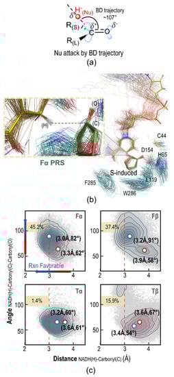 Figure 5 shows the pre-reaction state (PRS) analysis on the geometrical information in the MD simulations. It has been reported that the hydride transfer is the rate-determining step for the CpRCR-catalyzed reduction []. PRS analysis has been thus applied for the linear substrates, similar to the aryl-substituted ketones in the previous CpRCR studies [,]. In this work, we employed similar PRS protocols to measure the reactivity of 5-m-r heterocyclic ketones bound in the small cavity, as in the molecular dockings and MD simulations, by observing the pre-reaction state (Figure 5a) among all the possible conformations of enzyme-substrate complexes.