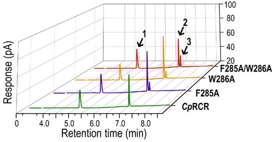 The GC traces of the wild type CpRCR and variants F285A, W286A, and F285A/W286A-catalzyed DHF reduction. Compounds 1–3 correspond to DHF, (S)-DHF-ol, and (R)-DHF-ol, respectively.