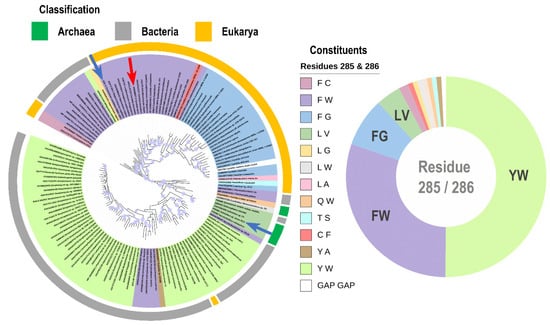 Phylogenetic tree of analogous proteins of alcohol dehydrogenases, with the maximum likelihood (ML) of 1000 bootstraps. The red indicator is CpRCR and the blue indicators are ADH from Geotrichum candidum and Sulfolobus tokodaii (Figure S7). The proportion of the different combinations of amino acid residues at 285 and 286 sites was shown in the pie chart at the bottom-right corner.