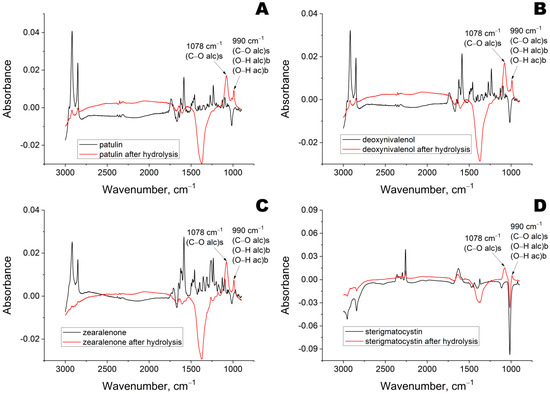 Previously, the GC/MS analysis of reaction medium after enzymatic hydrolysis of mycotoxins was performed [11], but the reaction product(s) could not be isolated. Therefore, the reaction media after enzyme hydrolysis of mycotoxins were analyzed using Fourier-transform infrared spectroscopy (Figure 2). The stretching modes of the C–O bond and the bending modes of the O–H bond within alcohols and carboxylic acids intensified significantly.