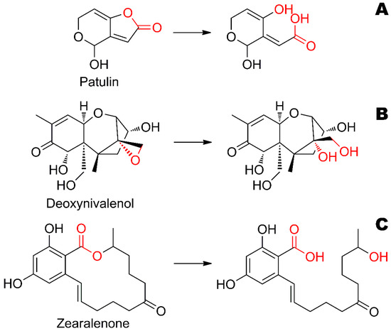 The proposed schemes of patulin (A), deoxynivalenol (B), and zearalenone (C) hydrolysis under the action of His6-OPH. Groups undergoing chemical transformations are highlighted in red.