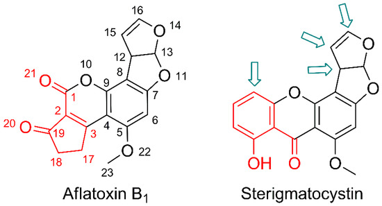 Chemical structure of aflatoxin B1 and sterigmatocystin. Structural motifs differing for these compounds are colored red. Sites for biochemical modification of sterigmatocystin by cytochromes [15] are highlighted by arrows. Aflatoxin B2 differs from aflatoxin B1 by single bond between C(15)–C(16).