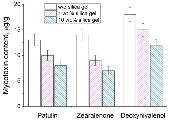Influence of silica gel additives on residual content of patulin, zearalenone, and deoxynivalenol in grain during simultaneous hydrolysis by His6-OPH/PLE50 (200 U/g) for 1 h in a 0.1 M carbonate buffer (pH 10.5). The grain was contaminated by mycotoxins at dose of 100 μg/g.