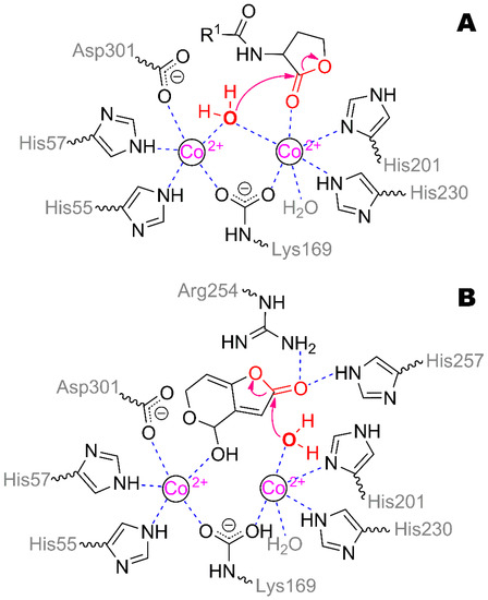 Hypothetical mechanisms of hydrolytic action of His6-OPH in reaction with N-acyl homoserine lactone (A) and patulin (B).
