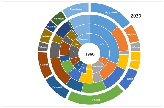 In the 1980s, almost half of the publications were on aluminas, silicas, silica–aluminas, and zeolites, while they currently represent only about 30%. Formulations containing Zirconium, Nobium, and Gallium have emerged (Figure 3).