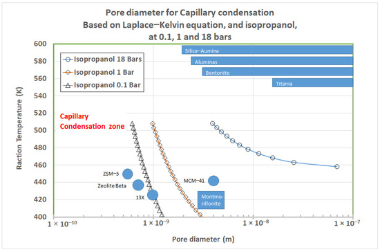 Capillary condensation in the porous catalyst should be considered, especially if the reaction has to be carried out under pressure. In order to maximize the catalyst activity, a large surface area is preferred. This would come with small pore diameter in which reagents and products could accumulate and lead to deactivation. So, when working under pressure, catalysts with larger pore diameters might be preferred. When capillary condensation occurs, the pores and the surface are saturated with IPA and the reaction can take place in a supported liquid-like phase or in conditions that favor DIPE formation. Especially, it is more likely to have two neighboring adsorbed IPA molecules on the catalyst surface, thereby increasing the chances of producing DIPE. To reduce side product formation, larger pore diameters, higher temperature, and/or lower pressure would be favorable.