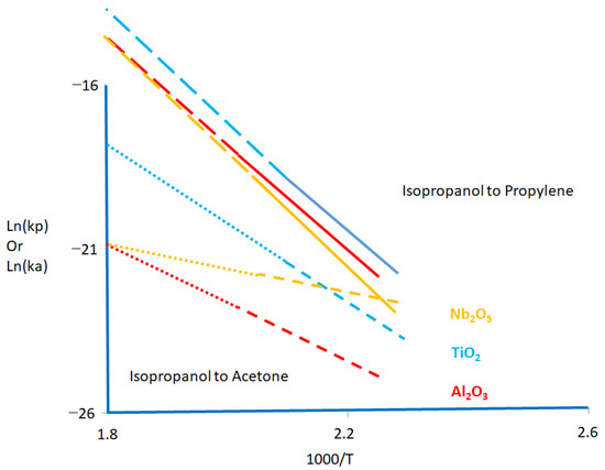 Arrhenius plots for acetone (dashed lines) and propylene (continuous lines) formation from isopropanol. Data computed from [50] and extrapolated to 280 °C.