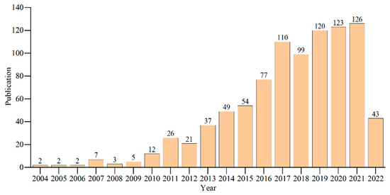 The temporal distribution of the number of literatures reflects the development trend of MCNT wastewater treatment research. In the last 20 years, the total number of publications in the field of research on wastewater treatment of MCNTs has increased significantly in general (Figure 1). This indicates that the research on MCNTs in wastewater treatment in general is developing, progressing, and gaining attention. The results of the average annual number of publications showed that the average annual number of publications in the field of MCNTs in wastewater treatment research reaches 48, and the total number of publications was gradually increasing. From 2004 to 2009, the initial stage of MCNTs use in wastewater treatment, the total number of studies was small, averaging 3.5 articles per year. From 2010 to 2015, the research on MCNTs in wastewater treatment started to take off and the number of literatures began to grow steadily, averaging 33.2 articles per year. From 2016 to 2021, the average number of articles exceeded 100 per year and showed a significant growth trend, with a gradual increase in researchers and represented the boom in research on MCNTs in wastewater treatment. However, from 2017 to 2020, with an average of 115 publications per year, its growth trend slowed. This may be due to the recent application of new materials such as gra-phene, biochar, ceramic membrane and metallic glass in wastewater treatment [33,34,35,36]. In general, the research literature related to the use of MCNTs for wastewater treatment is gradually increasing. This is because MCNTs, as new wastewater treatment materials, have features such as high permeability, anti-pollution, excellent electrical and adsorption properties, and achieve better separation in water treatment than traditional industrial materials (silica gel, activated carbon, etc.).