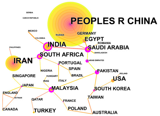 Visualization of cooperating countries in MCNTs studies (Figure 2) can not only identify the core countries in the research field of wastewater treatment of MCNTs but also reflect the academic exchange and cooperation between research countries in this field. In this study, country was chosen as the object of analysis in CiteSpace, the time slicing was set to “2004–2022”, the years per slice was 1, and a threshold of top 50. Finally, the country analysis mapping was obtained (39 network nodes and 41 connections, density of 0.0553). The number of occurrences of the country were represented by the frequency, the position of the state in the field is represented by centrality. The more countries are connected, the more central the country is, the richer the study of the country is, and the more important the location of the country is. China was the country with the highest number of publications in this field (a frequency of 422), which is significantly larger than other countries, which indicates that China contributes significantly to the field of MCNT wastewater treatment, and its development status is in a leading position. Iran was ranked second (a frequency of 156) and India was ranked third (a frequency of 71) (Table 1). In terms of centrality, Saudi Arabia was the highest with 1.04, which indicates its central position within the field of MCNT wastewater treatment and its close relationship with other countries. It also indicates that researchers in Saudi Arabia tend to cooperate with other countries to complete research in the field of MCNT wastewater treatment. In terms of year, China appeared in 2004, which is currently the earliest appearance. China is a large country at the forefront of current economic development, which indicates that research on MCNT wastewater treatment is an important research hotspot at present and even in the future.