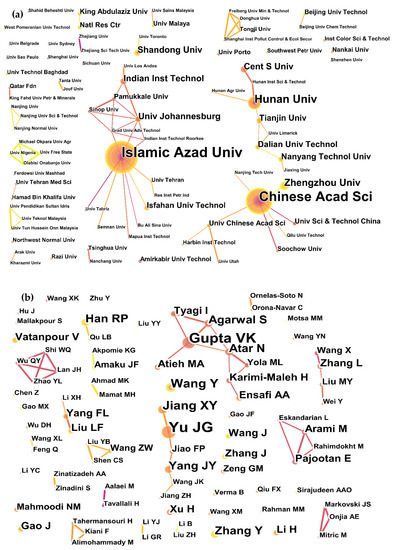 By using the institutions in CiteSpace as the analysis objects, an institutional analysis graph was obtained (101 network nodes and 67 connections with a density of 0.0133). The nodes in the graph are relatively dense and most of the data are available, while the total number of connections is only 67, indicating that institutional cooperation in the field of MCNT wastewater treatment is relatively frequent and some of them have obvious geographical characteristics (Figure 3a). Cross-institutional research and cooperation in the field of MCNT wastewater treatment need to continue to maintain transnational cooperation and strengthen academic exchanges. Meanwhile, the top ten publishing institutions in the field of wastewater treatment by MCNTs were compiled (Table 2), of which a total of nine institutions published more than 10 papers. Relatively speaking, these institutions are the most numerous institutions in the research field of MCNT wastewater treatment, and six of them are from China, which indicates that the depth and breadth of research in the field of modified CNTs wastewater treatment by Chinese institutions are more prominent compared with other countries. In terms of publication year, the top 10 universities were all first published after 2010, indicating the rapid progress of MCNT wastewater treatment technology and the relative novelty of the topics. In terms of centrality, the University of Chinese Academy of Sciences (UCAS) has the highest centrality of 0.05, indicating that UCAS is an important bridge to promote cooperation among universities and is a university that has made great contributions in the field of CNTs wastewater treatment and promoted the development and progress of MCNT wastewater treatment. Furthermore, the half-life of the University of Chinese Academy of Sciences is seven, ranking first, which indicates that the research results of the University of Chinese Academy of Sciences have high theoretical value and still have great research prospects in the future.