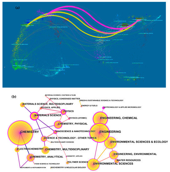 Discipline association analysis is performed by linking the cited literature to the discipline of the cited literature, whose citations form the research frontier, and the cited literature forms the knowledge base. The JCR journal map option was selected in the overlay map option, and then the information service data were overlaid onto the original citation literature discipline base map by the add overlay feature of CiteSpace to obtain the dual-map overlay map of the discipline distribution involved in the research field of MCNT wastewater treatment (Figure 4a). The left half takes the discipline distribution of the cited literature as the research status of modified CNT wastewater treatment; the right half takes the discipline to which the cited literature belongs as the research basis of modified CNT wastewater treatment. The curves connect the relationship between the research status and the research base, and the inner numbers of the ellipses indicate the number of papers in each discipline. As shown in Figure 4a, the left side of the figure shows the main journal distribution groups of MCNT wastewater treatment in Web of Science database, and the right side of the figure shows the main cited journal groups. It can be concluded that the research in the field of MCNT wastewater treatment was mainly concentrated in the journal groups of physics, chemistry, material science, medicine, molecular science, and neurology. Citations in the field of MCNT wastewater treatment were mainly concentrated in the journal groups of molecular science, biology, chemistry, physics, mathematics, environmental science, computers, and systematics. Among them, four outward citation paths exist in veterinary medicine and physics in the citation domain on the left side of the figure, and this cluster was the most dominant citation cluster. Additionally, the corresponding chemistry, materials science, and chemistry clusters have the highest number of citations with a z-value of 5.127 when physical science, materials science, and chemistry are used as source journals.