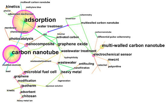 The keyword “adsorption” is the most frequently occurring term in this field (162), which indicates that the function of adsorption is the main research basis and has received much attention from scholars (Table 6). CNTs were widely used for the removal of pollutants in water treatment because of their good adsorption properties [3,40]. Next, “carbon nanotube” ranked second in frequency (123). The studies have shown that the research on CNTs dates to a paper by Sumio Iijima [11] published in Nature in 1991. The frequency of “multi-walled carbon nanotube” ranked third, indicating that “multi-walled carbon nanotube” has become a hot spot for research. The term “multi-walled carbon nanotube” was widely used in the preparation of composite materials [40]. By centrality, “wastewater” is the highest (0.94), which indicates a central position within the field of MCNT wastewater treatment. In recent years, with the in-depth research, modified CNTs have been used in oil-containing wastewater treatment, printing and dyeing wastewater treatment, and pollutant removal from domestic wastewater [24]. The half-life represents the duration of the keyword’s research value, and the half-life of “carbon nanotube” is the highest (12), indicating that CNTs have great research space in the future.