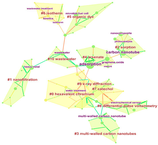 The studies of MCNT wastewater treatment were grouped into 11 categories, namely #0 hexavalent chromium, #1 nanocomposite, #2 sorption, #3 multi-walled carbon nanotube, #4 arsenate, #5 organic dye, #6 isotherm, #7 catecho, #8 differential pulse voltammetry, #9 x-ray diffraction, and #10 wastewater (Figure 6). Based on the cluster location analysis, the 11 research clusters were classified into three types, among which the first type of clusters is not the mainstream area of wastewater treatment research for MCNTs because of their deviation from the main body and the small number of studies. This type is mainly a cluster with “#6 isotherm” as the clustering keyword, and this cluster gathers “kinetics”, “wastewater treatment “, and “isotherm”. The second type is relatively independent from the main study at a certain distance, but has a certain amount of research, this type includes the “#8 differential pulse voltammetry” keyword. The third type of taxa are those that overlap with each other and have close inheritance and derivation relationships. They include “#0 hexavalent chromium”, “#1 nanocomposite”, “#2 sorption”, and “#3 multi-walled chromium”. “#3 multi-walled carbon nanotube”, “#4 arsenate”, “#5 organic dye”, and “#7 catechol”, “#9 x-ray diffraction”, and “#10 wastewater” as cluster labels, and the largest number of clusters is in the research direction of wastewater treatment. The research was about the application of MCNTs for the treatment of various wastewaters, such as heavy metal wastewater (chromium), printing and dyeing wastewater, phenolic wastewater, benzene o-diphenol, etc.