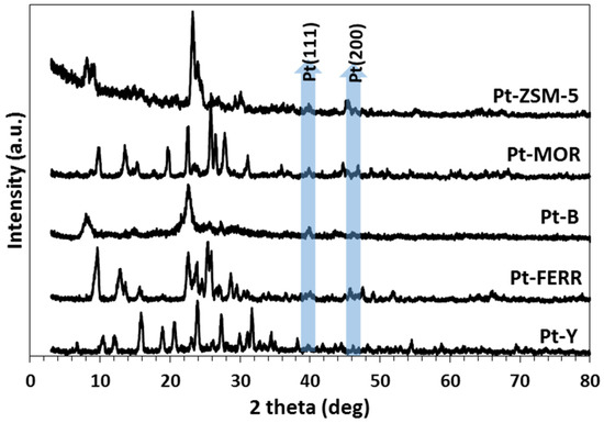 The formation of Pt nanoparticles incorporated into the different applied supports was investigated using the XRD technique. Figure 1 shows the XRD analysis of the Pt-incorporated zeolite materials.
